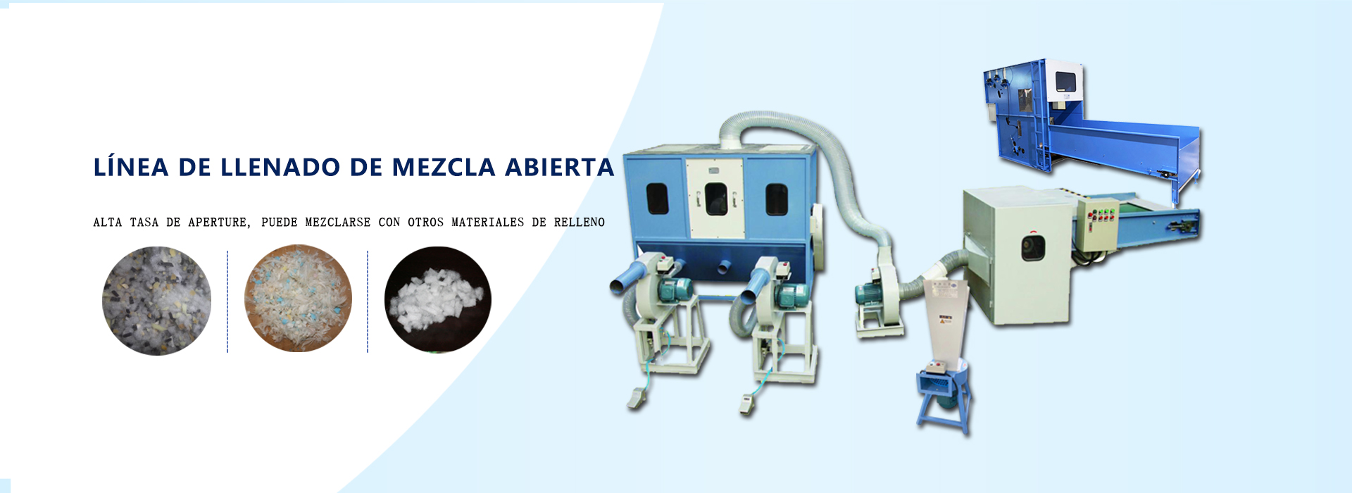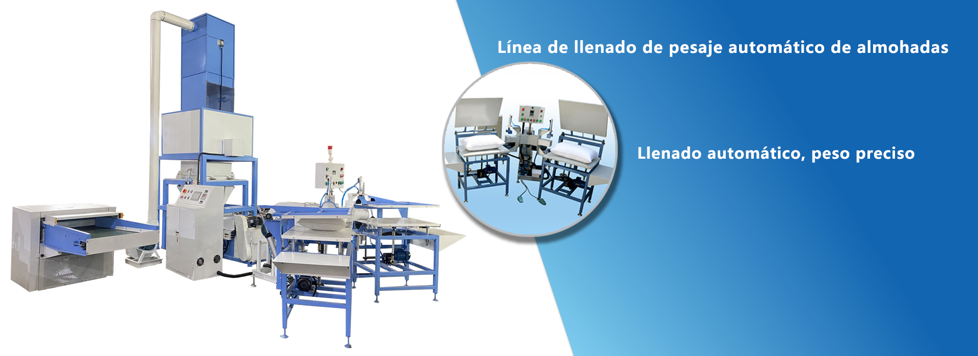 Utilizando un sistema de control de alta tecnología y un sistema de pesaje, Abrir el material de fibra para obtener un peso exacto, Relleno automático de almohadas / cojines.
