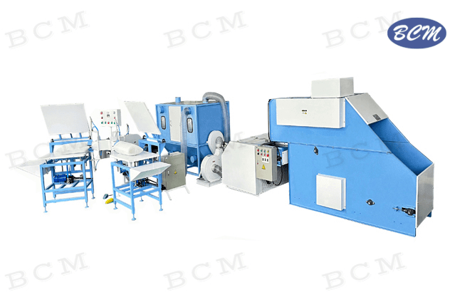 该生产线包括纤维棉开包机,珍珠棉机、送料风机,混合机和双头填充机。