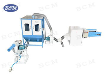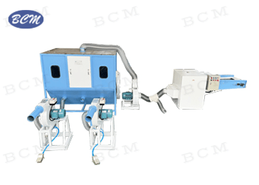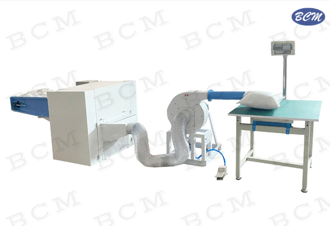 将原材料纤维棉开松,将新开松的纤维棉充入靠垫、抱枕,效果蓬松,自然,节省人工,生产高效率。